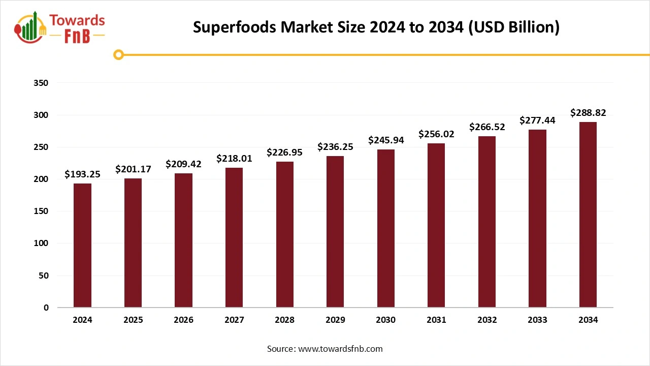 The global superfoods market reached a valuation of USD 193.25 billion in 2024 and is projected to grow to USD 288.82 billion by 2034, reflecting a CAGR of 4.1% during the forecast period. This robust growth is driven by the increasing consumer preference for plant-based, natural, and nutrient-dense foods that promote overall wellness, immunity, and a balanced lifestyle.